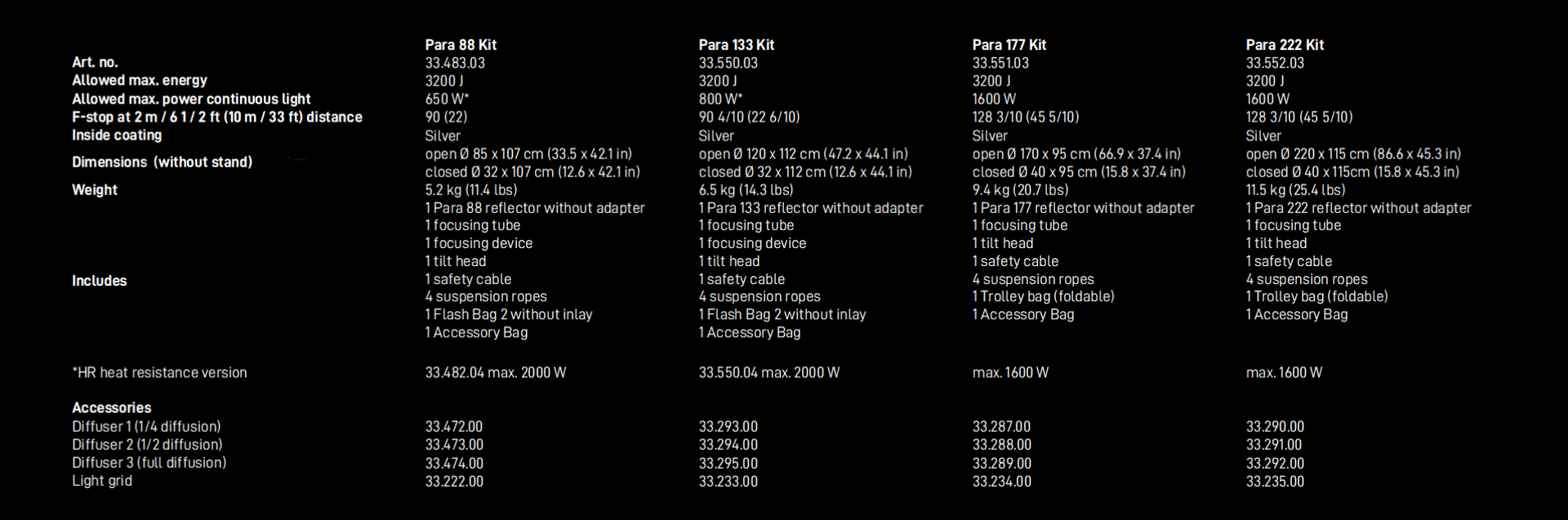Trotz seiner Grösse ergibt ein Para kein weiches Licht. Das typische Para Licht hat keine Diffusion und kein kontrastminderndes Licht in der Nähe der Aufnahmeachse, wie man es von anderen grösseren Lichtformern kennt. Die einzigartige Konstruktion des Para ermöglicht die unverwechselbare und sehr schöne Hauttextur bei Porträts.